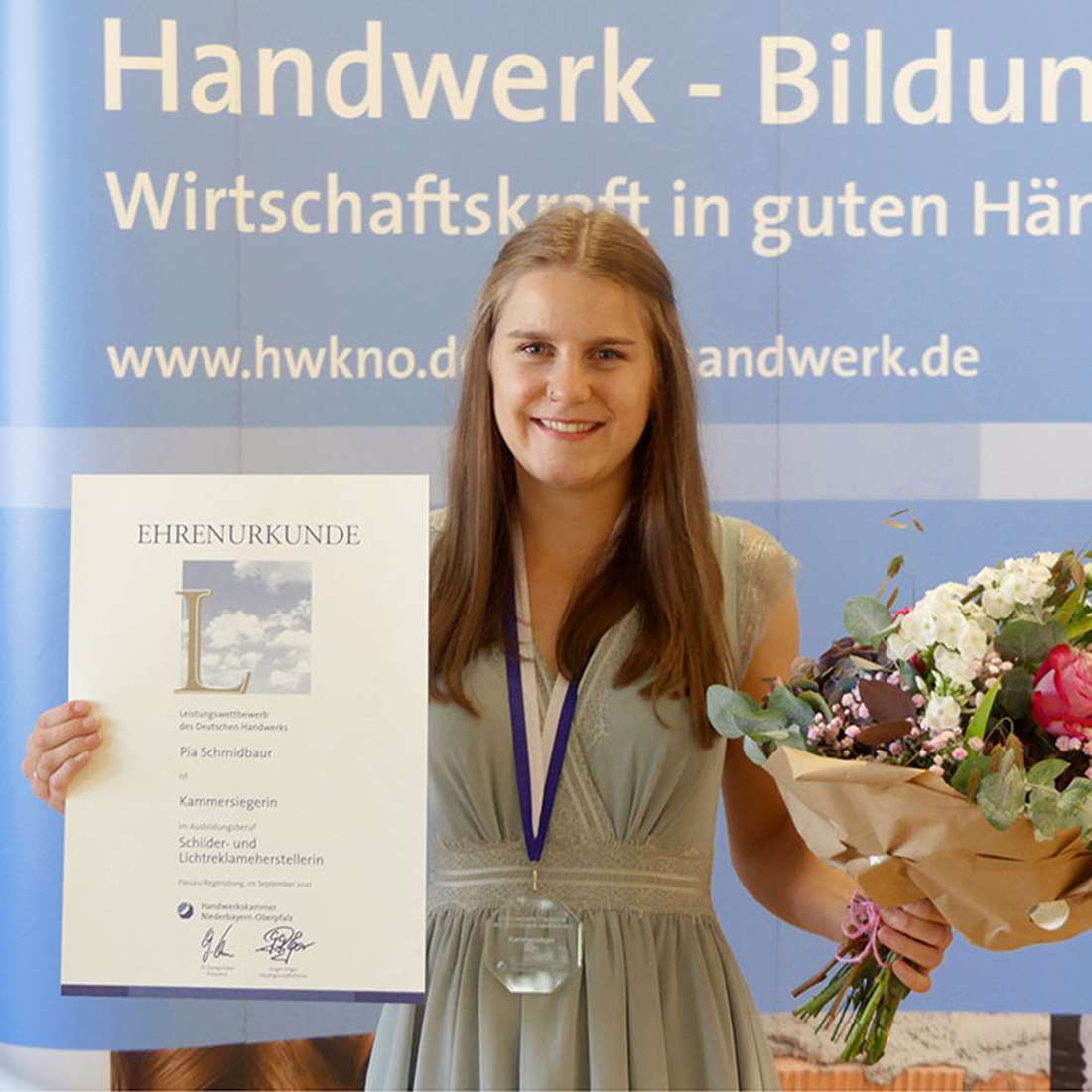 Die Schilder- und Lichtreklameherstellerin Pia Schmidbaur holte sich mit ihrer tollen Prüfungsarbeit den Titel „Kammersiegerin“ Niederbayern und Oberpfalz und gehört nun zu den besten Nachwuchshandwerkern.