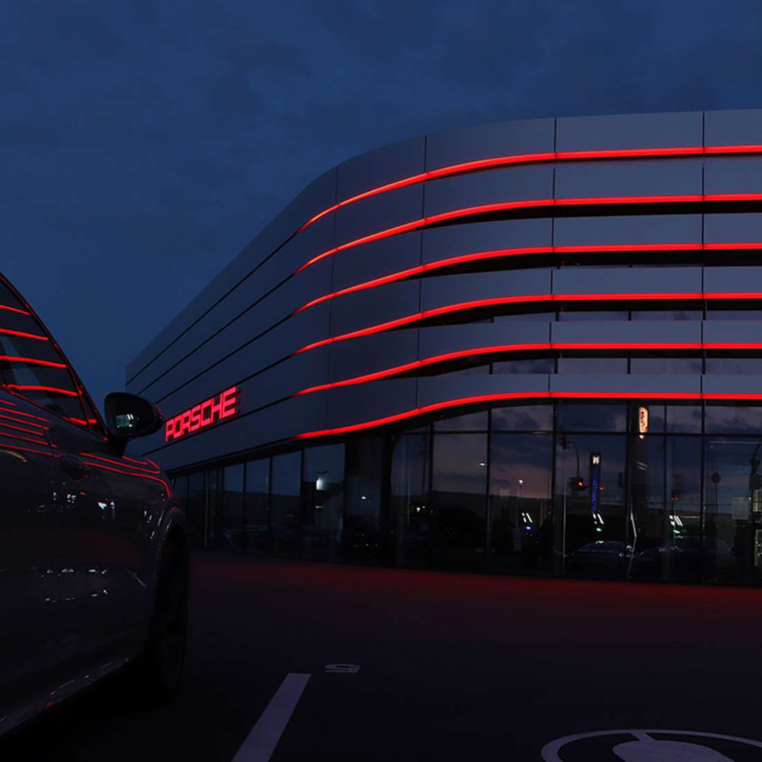 Plastisch und farbtreu verschmelzen Marke und Fassadenbeleuchtung mit den modernen Aluminium-Panelen des Porsche-Zentrums zu einer Einheit und schaffen so das perfekte Entree für das intensive Markenerlebnis im Inneren.