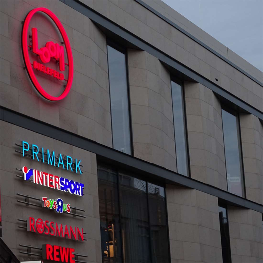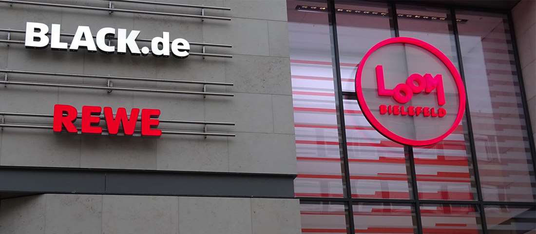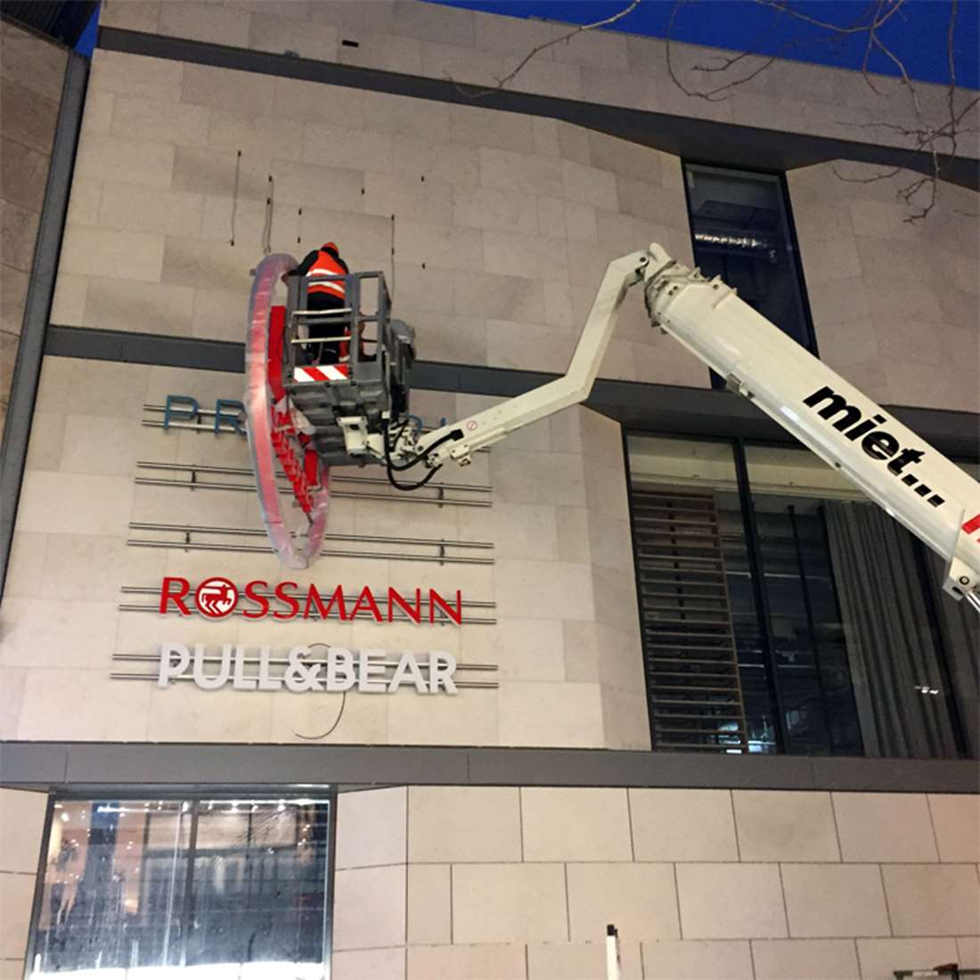 Zigtausend Besucher strömen seit Ende 2017 unter dem knapp 3 Meter großen Logo durch und bemerken sicher nicht, was hinter der runden Lichtwerbeanlage steckt, die sich harmonisch an die Glasfassade anschmiegt.