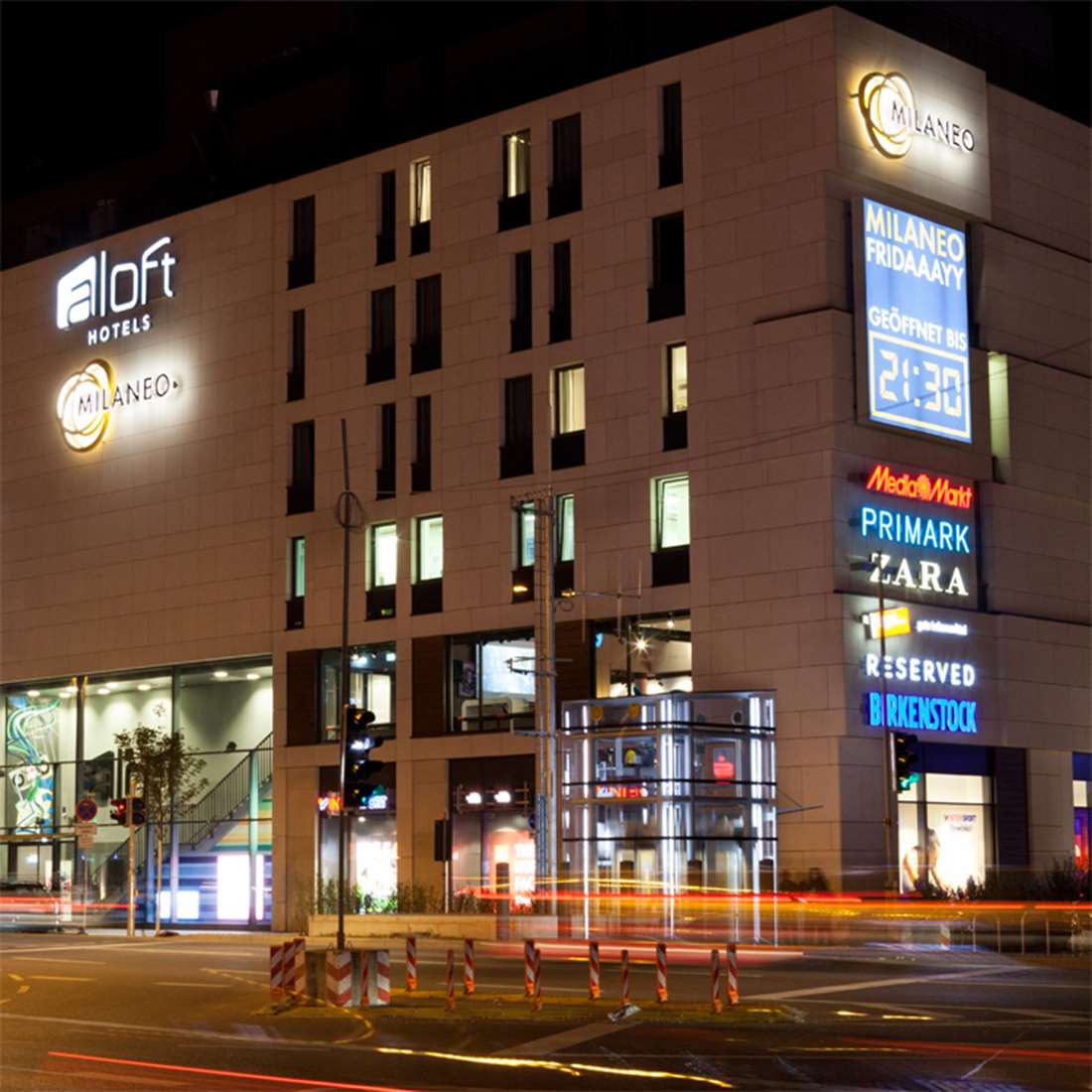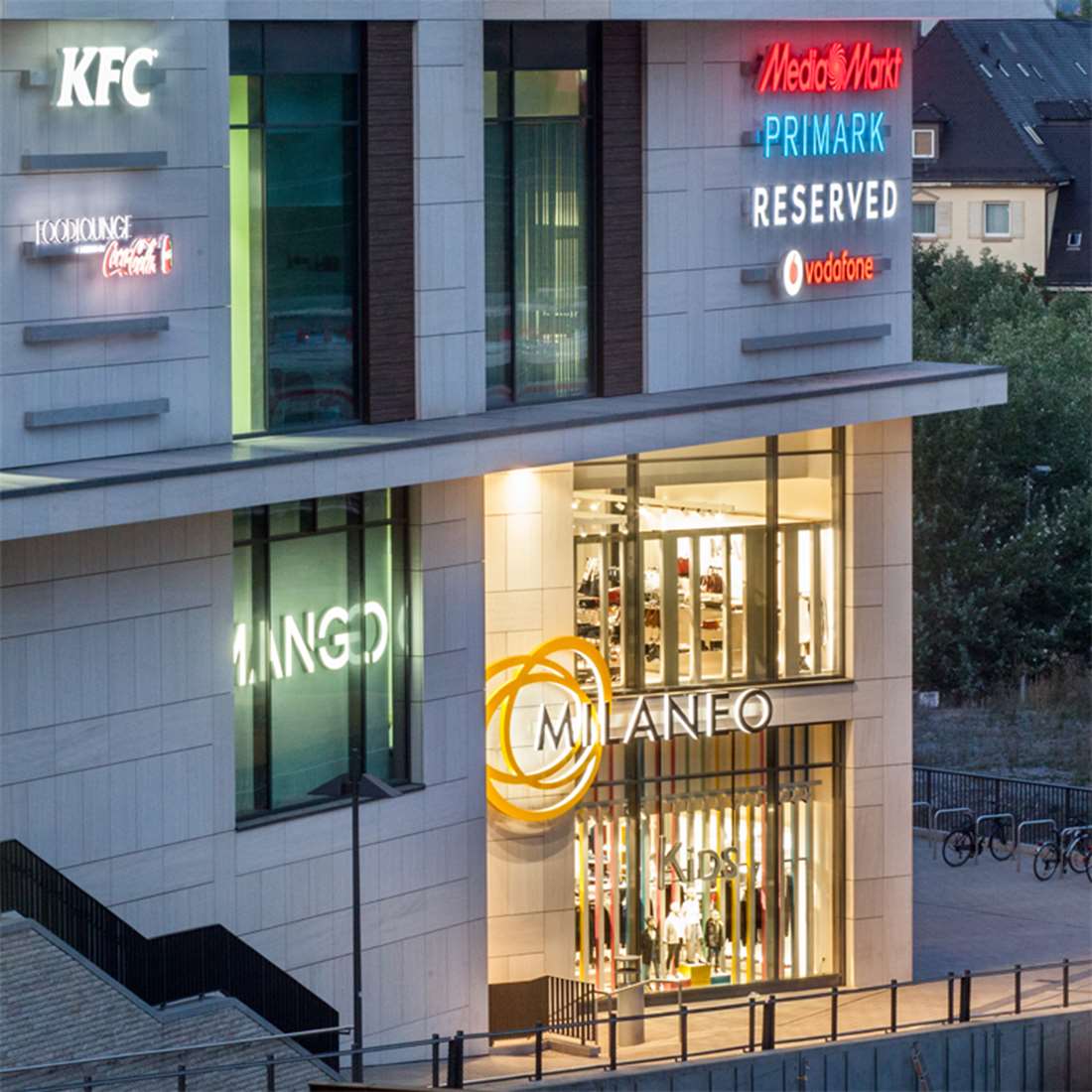 Mit 43.000 m² Fläche für Geschäfte und Gastronomie ist das Milaneo das größte Einkaufszentrum der Region. Neben den auffälligen Milaneo-Schriftzügen realisierten wir zahlreiche Mieterwerbungen, die gesamte Parkplatz- und Centerbeschilderung u.v.m.