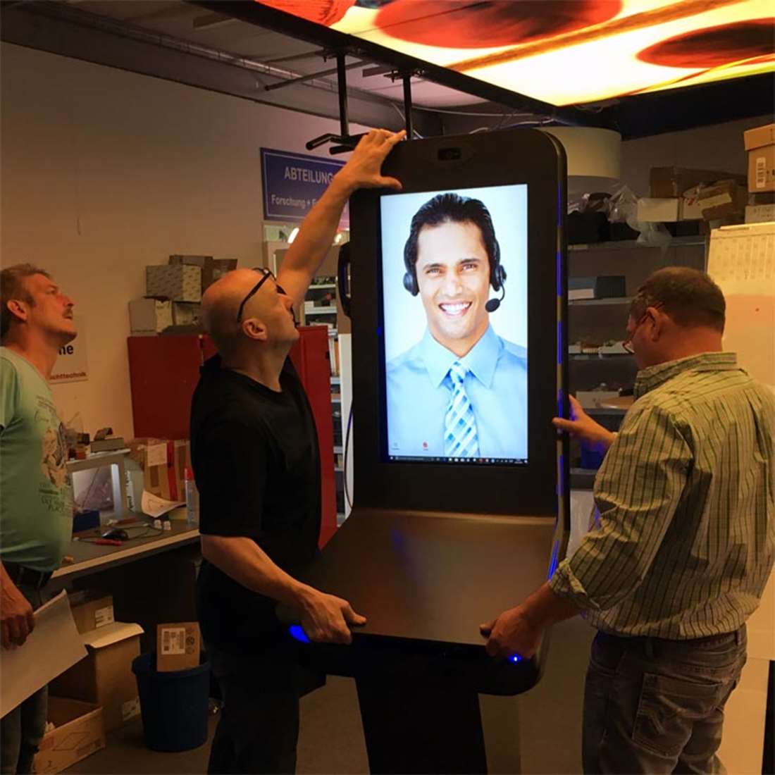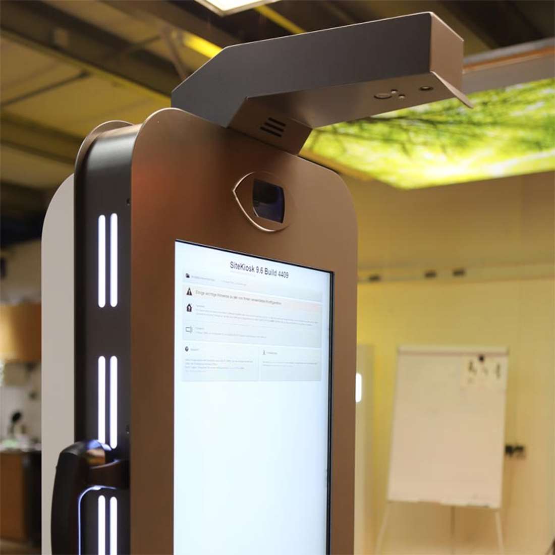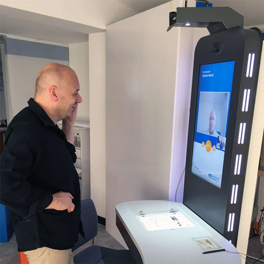Beim Betreten der diskreten Kabine wird ein Bewegungssensor ausgelöst und auf einem in die Stele integrierten Bildschirm schaltet sich automatisch ein Mitarbeiter der Bankzentrale zu.