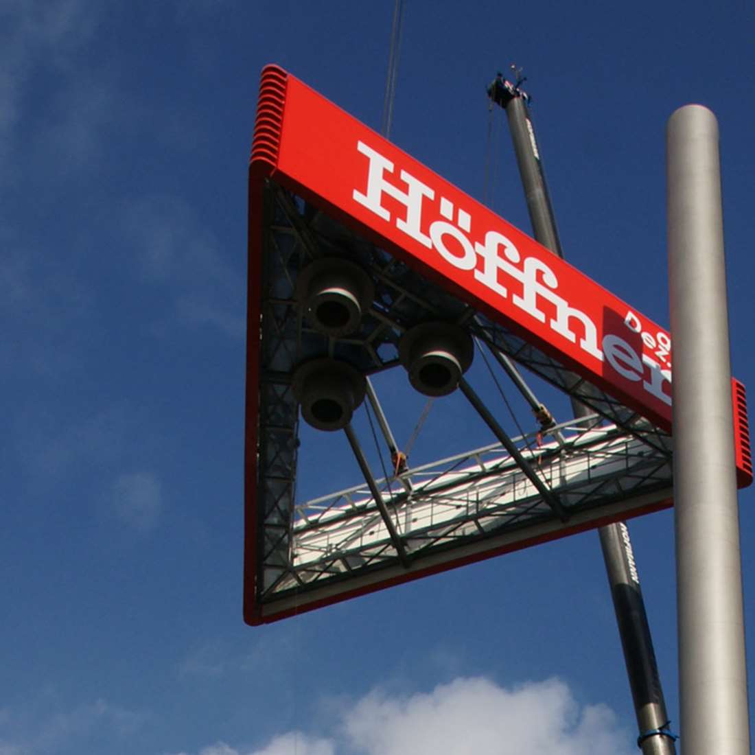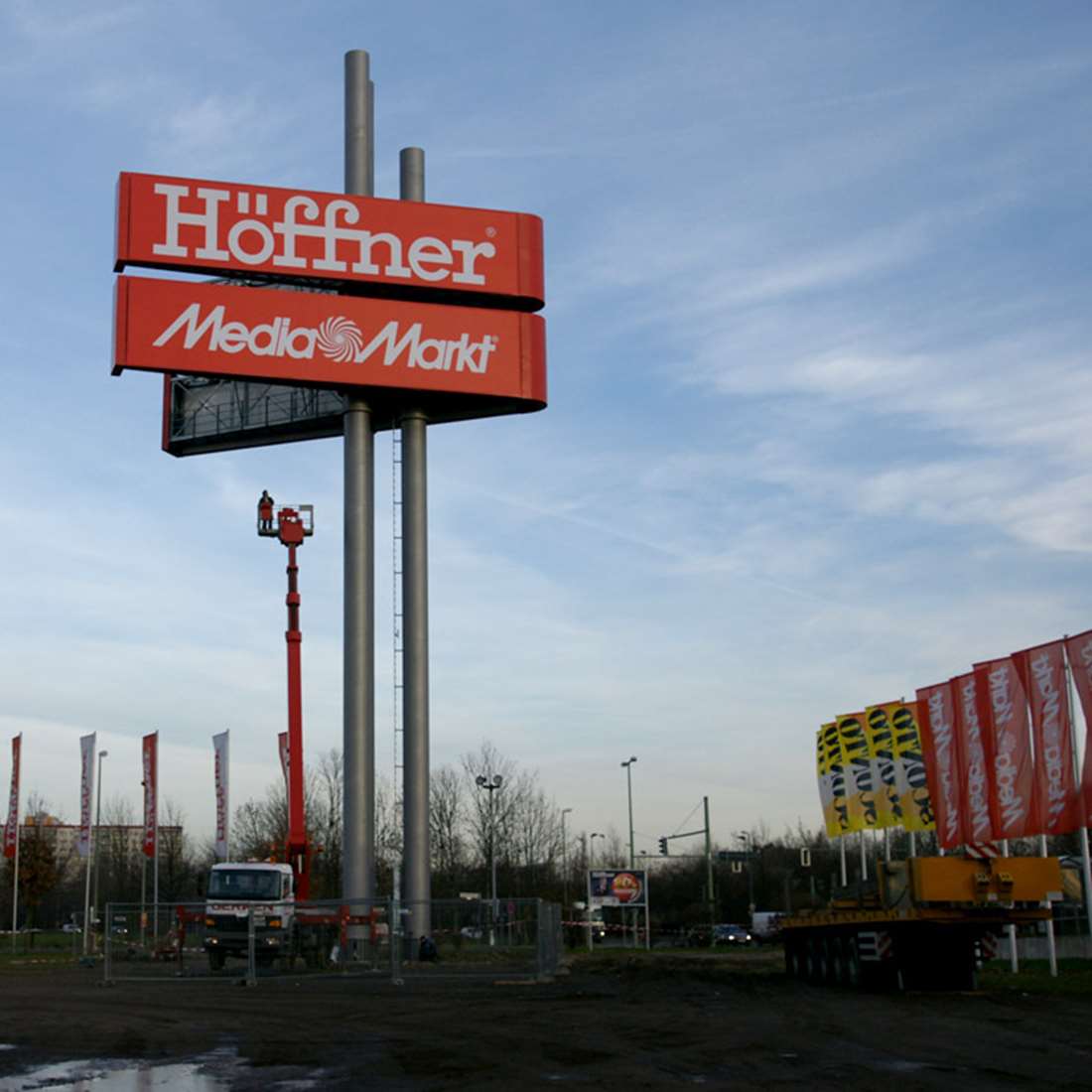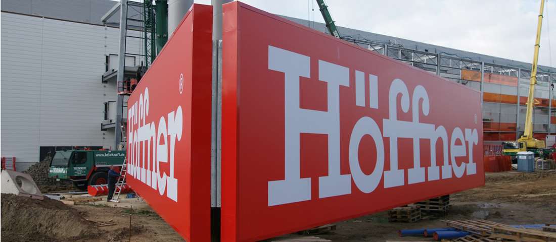 Ende 2014 wurde in Neuss das modernste Einrichtungshaus NRWs eröffnet. Ein weiteres gigantisches Möbelhaus des traditionsreichen Familienunternehmens Höffner – in neuer Dimension. Bei diesem Projekt legte das Unternehmen höchsten Wert auf eine beständige und helle Ausleuchtung, auf unkomplizierte Wartung und hohe Witterungsbeständigkeit. Unsere energiebewusste Lösung mit Lichtsensortechnik garantiert eine homogene Ausleuchtung mit maximaler Lebensdauer. Die Wartung erfolgt über rückseitige Stege und eingebrachte Revisionsklappen, die eine problemlose und kosteneffiziente Instandhaltung ermöglichen. Durch die spezielle Beschichtung der eingesetzten Transparente sieht der Pylon auch in ferner Zukunft noch aus wie neu. Ein Pylon von unglaublichen 50 Metern Höhe ragt nun in den Himmel von Neuss und begrüßt die Kunden des Möbelhauses.