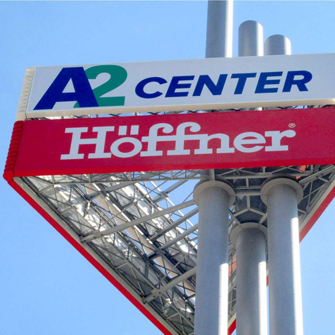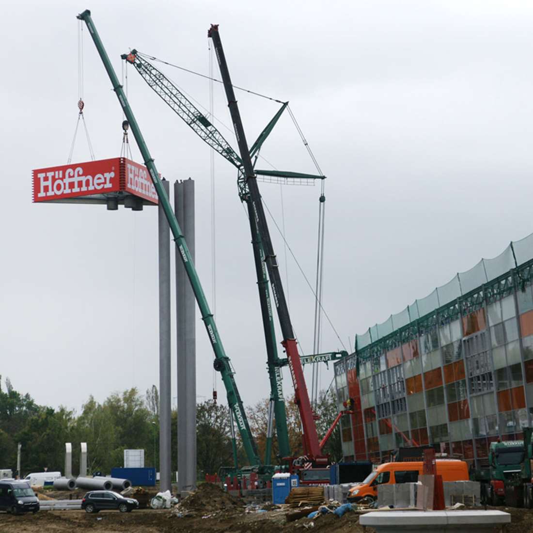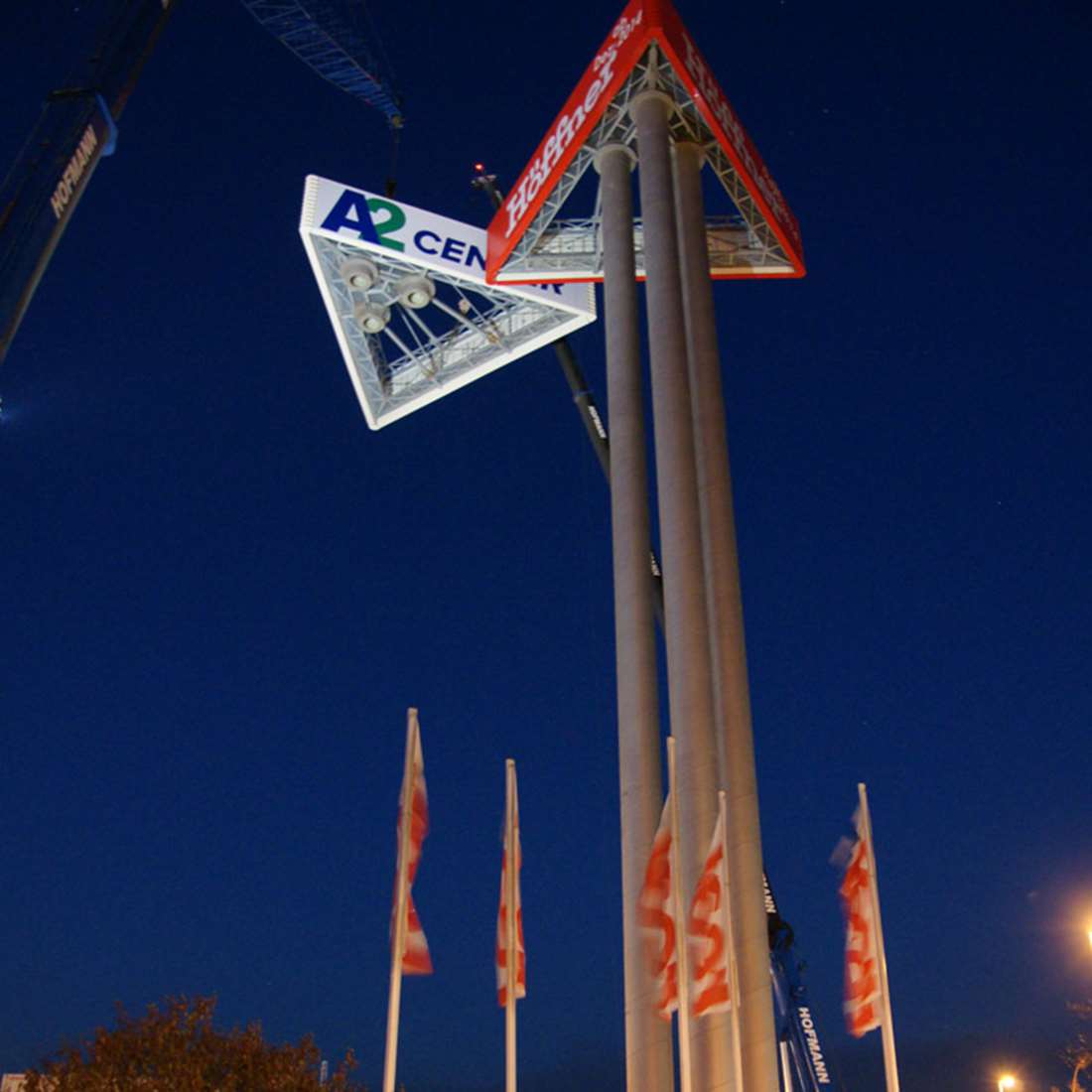 Ende 2014 wurde in Neuss das modernste Einrichtungshaus NRWs eröffnet. Ein weiteres gigantisches Möbelhaus des traditionsreichen Familienunternehmens Höffner – in neuer Dimension. Bei diesem Projekt legte das Unternehmen höchsten Wert auf eine beständige und helle Ausleuchtung, auf unkomplizierte Wartung und hohe Witterungsbeständigkeit. Unsere energiebewusste Lösung mit Lichtsensortechnik garantiert eine homogene Ausleuchtung mit maximaler Lebensdauer. Die Wartung erfolgt über rückseitige Stege und eingebrachte Revisionsklappen, die eine problemlose und kosteneffiziente Instandhaltung ermöglichen. Durch die spezielle Beschichtung der eingesetzten Transparente sieht der Pylon auch in ferner Zukunft noch aus wie neu. Ein Pylon von unglaublichen 50 Metern Höhe ragt nun in den Himmel von Neuss und begrüßt die Kunden des Möbelhauses.