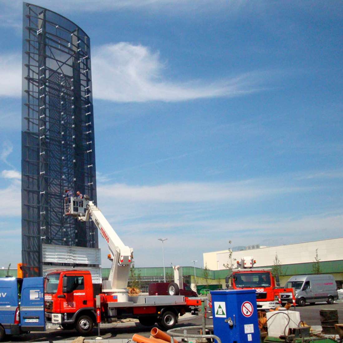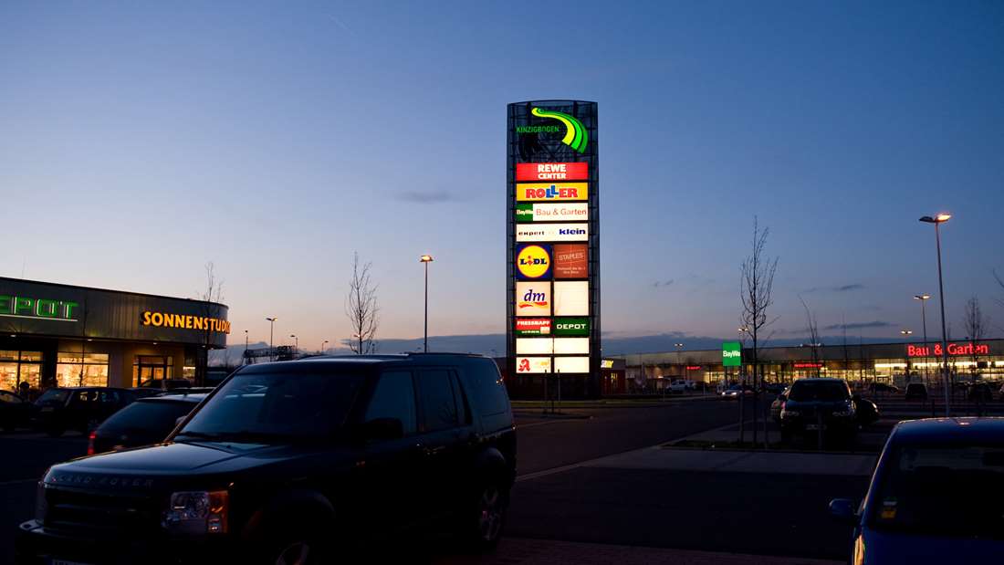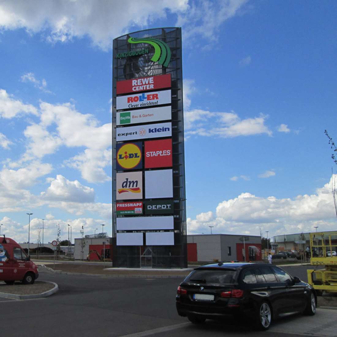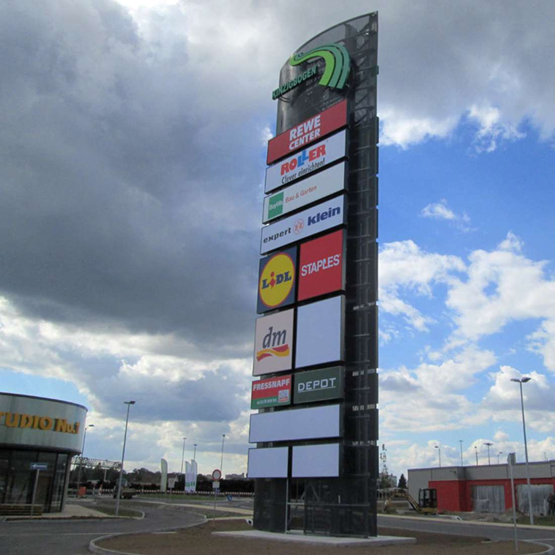 Nach reiflicher Überlegung und einer Höhen- und Einsehbarkeitsbestimmung mittels Helium-Ballon am Standort, fiel die Entscheidung auf einen mächtigen Gemeinschaftspylon von 22 m Höhe und 7 m Breite. Die Abstimmung mit den beteiligten Fachmärkten war eine ebenso große Herausforderung wie die statische Planung der aufwendigen Stahlkonstruktion.