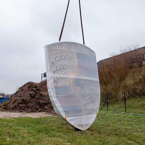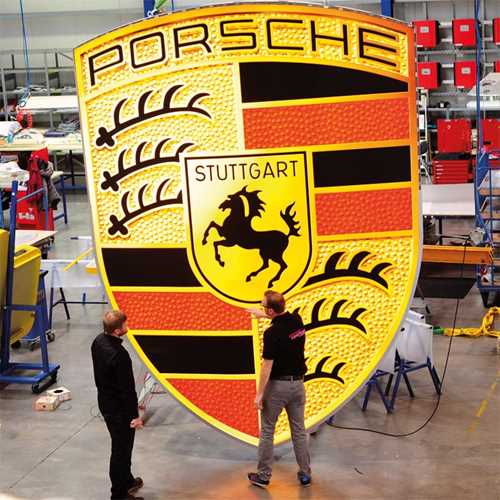 Dreidimensionale Spanntuchtransparente in Wappenform? Für Porsche machen wir das scheinbar unmögliche möglich