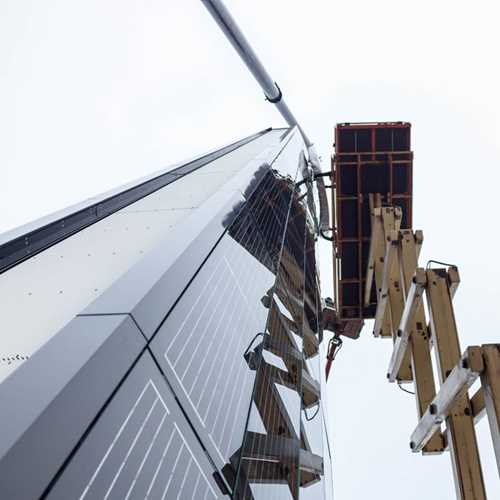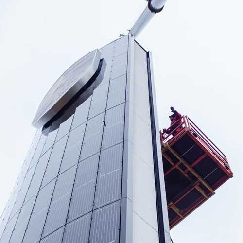 Als das Generalunternehmen mit der Idee des 25 Meter hohen Solar-Pylons auf uns zukam, waren wir sofort begeistert. Wir planten und realisierten die imposanten Porsche-Wappen mit einer Breite von 3,25 und einer Höhe von 4,3 Metern.