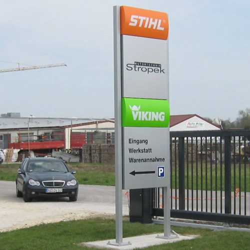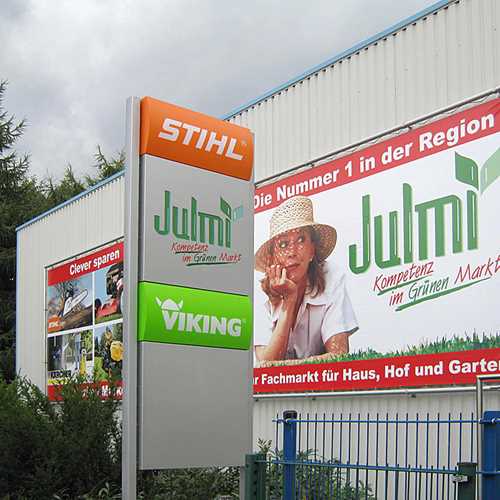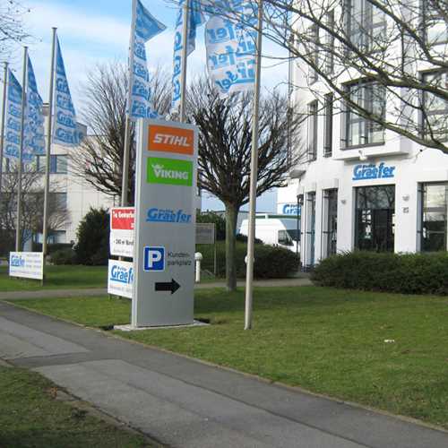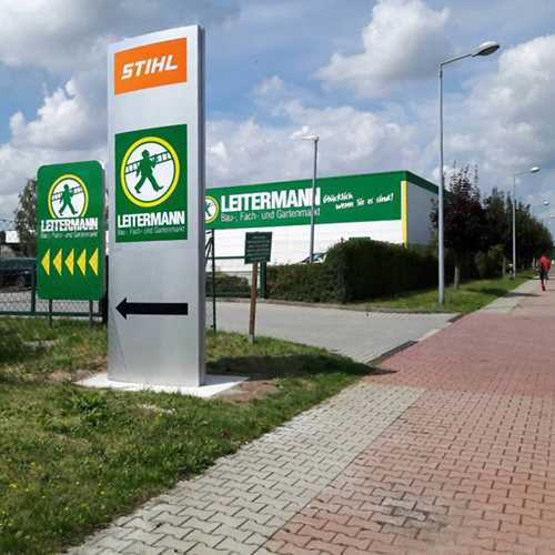 Für die einheitliche, bundesweite Händlerkennzeichnung suchte das Waiblinger Großunternehmen auf der EuroShop 2008 nach einem zuverlässigen Partner. Klare Vorgabe war ein Rundum-Sorglos-Paket, technische Aufmaße, Entwürfe und die Erstellung und Abwicklung der Bauanträge inklusive. Wir entwickeln ein modulares System: Die Produktspanne umfasst zwei verschiedene Arten von Fassadenbändern in unterschiedlichen Längen, Pylone und einige Wegweiser. Sonderformschnittanlagen der berühmten Motorsäge in Breiten bis zu 500 cm runden das Gesamt-Paket ab. Selbst unter der Sonne Spaniens strahlen zahlreiche Werbeanlagen „Made in Freystadt“.