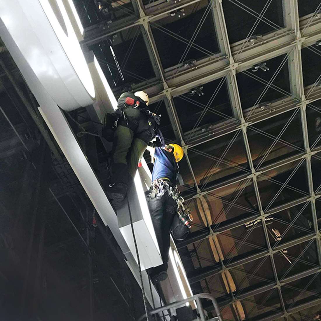 So meisterten wir im Vorfeld für unseren Kunden alle statischen und befestigungstechnischen Herausforderungen sowie sämtliche Abstimmungsarbeiten mit der Deutschen Bahn. Die Montage der 14 Meter langen und 4,5 Meter hohen Anlage entlang der Glasschürze ist besonders heikel, unser Montageteam behält die nahen Oberleitungen immer im Visier.
