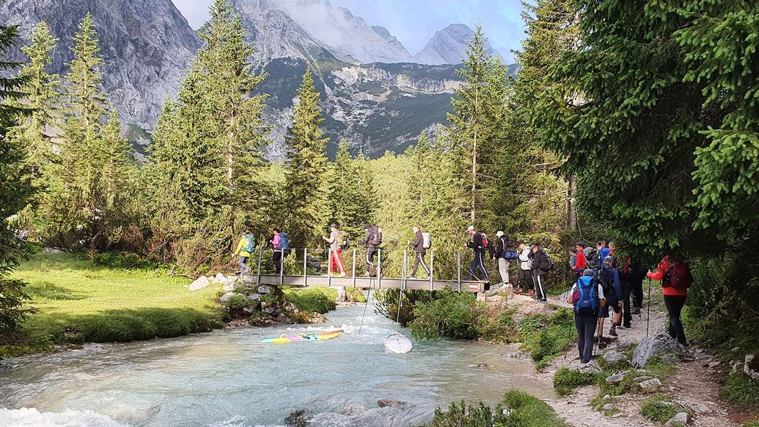 Ausgangspunkt der zweitägigen Wanderung war dort die Olympiaschanze auf 708 m. Das gemeinsame Ziel: die Zugspitze mit ihren 2962 m. Aufgrund der starken Regenfälle am Wochenende zuvor, musste die Gruppe bereits am ersten Tag einen weiten Umweg in Kauf nehmen. Nach rund 20 km Fußmarsch und 950 gelaufenen Höhenmetern erreichte das Team nach sechs Stunden reiner Gehzeit erschöpft das erste Etappenziel.