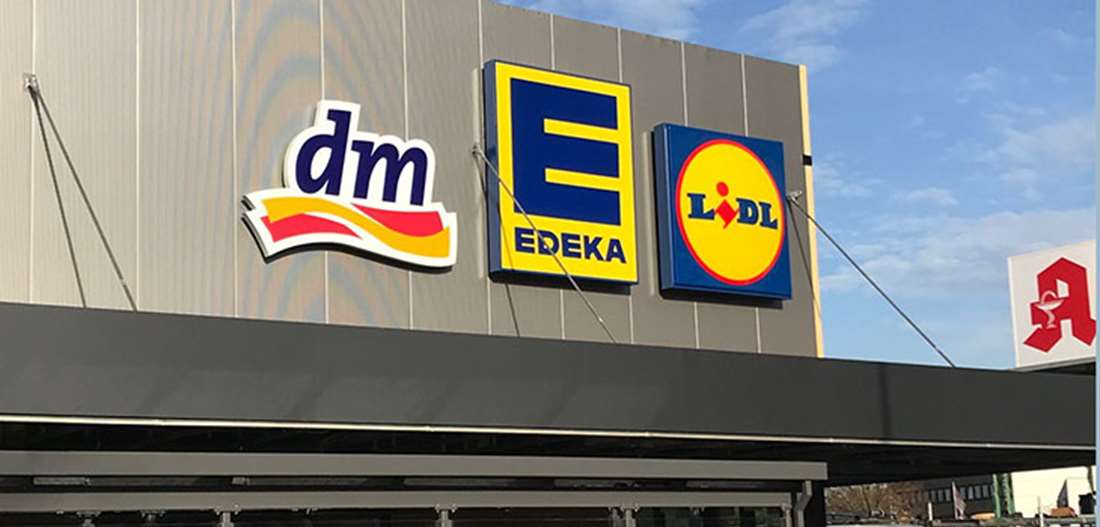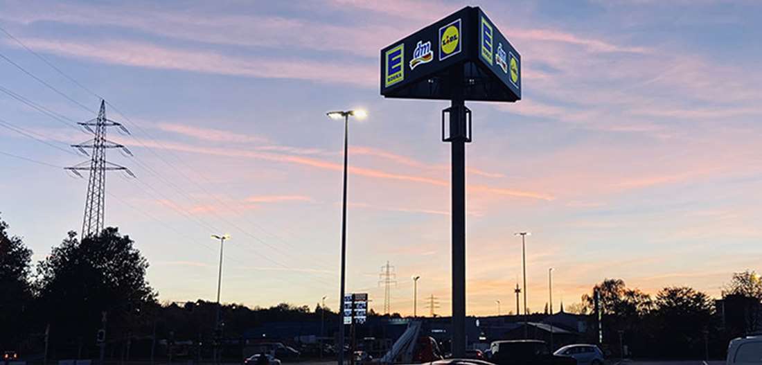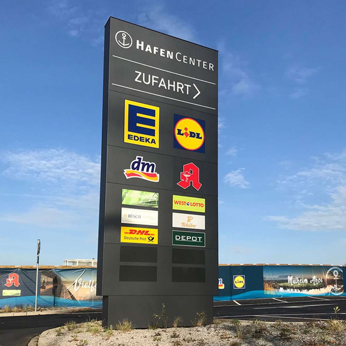 Alle Werbeanlagen, die Einzelbuchstabenanlagen mit der Bildmarke, Hinweisstelen, Spanntuchtransparente, Dibondschilder und 160 lfm Bauzaunbanner, begrüßten die Gäste.