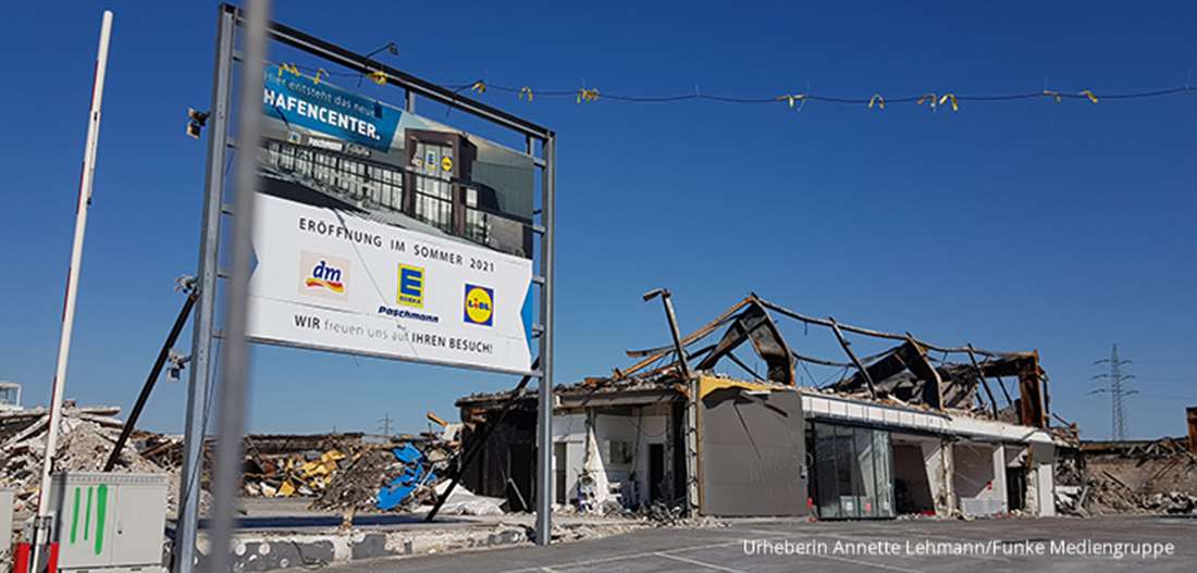 Nach dem Großbrand im Februar stand in der Weseler Straße nur noch unsere Bautafel unversehrt wie ein Fels in der Brandung. Die Abrissbagger mussten anrücken, um die verbrannten Gebäudereste zu zerlegen und das gesamte Bauvorhaben fiel in eine kurze Schockstarre. Letztlich konnte das Center unter einem straffen Zeitplan doch neu aufgebaut und realisiert werden.