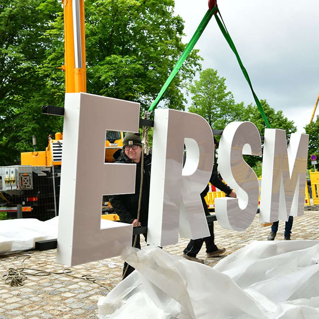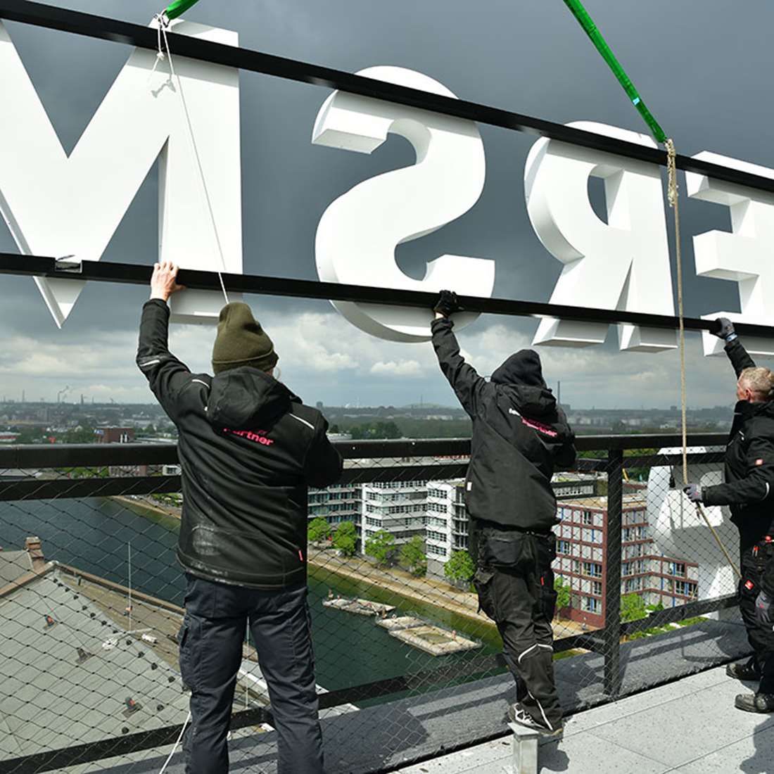 Diese Montagetechnik erforderte eine fast schon millimetergenaue Vorbereitung. Dank der präzisen Vorarbeit des verantwortlichen Projektleiters konnten alle Schriftzüge in luftiger Höhe von 38 Metern, reibungslos und in Rekordzeit eingehängt und montiert werden. Davon konnte uns auch das launische Wetter nicht abhalten. Das freute nicht nur uns, sondern auch alle Passanten, denn die Straße war während dieser Zeit natürlich in beide Richtungen gesperrt. Zum Einen aus Sicherheitsgründen und der Kran musste auch dort stehen.