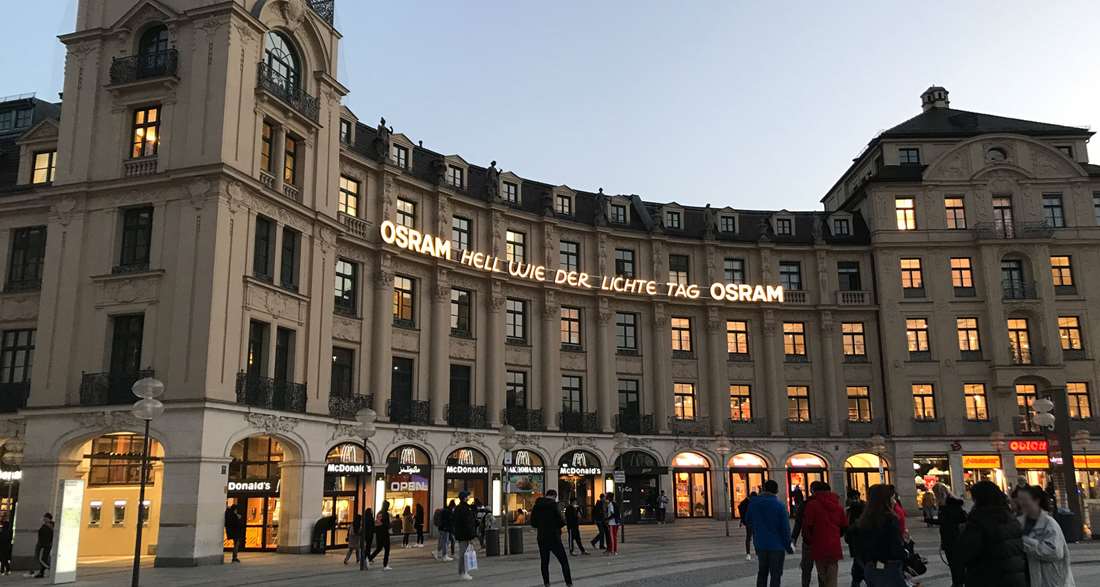 Bereits im September 2019 mussten die beiden Neon-Schriftzüge von Osram „Hell wie der lichte Tag“ abgehängt werden. Nach über 60 Jahren Lebensdauer wiesen die Anlagen immer wieder Defekte auf. Vor wenigen Wochen kehrten sie an den Karlsplatz zurück. Natürlich mit moderner LED-Technik, obwohl sie äußerlich nicht von der ursprünglichen Lichtinstallation zu unterscheiden sind.