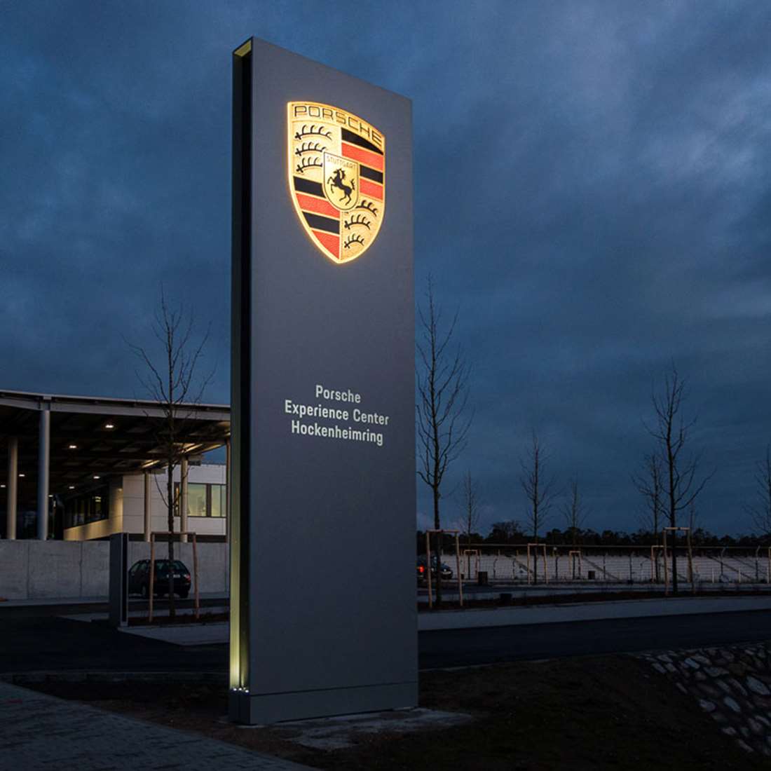 Gemeinsam mit Porsche haben wir in den zurückliegenden Monaten das Facelift der Corporate Identity (CI) auf die unterschiedlichen Lichtwerbeanlagen übertragen. Beginnend mit ersten Ideen und Mustern entstand so ein praxistaugliches Werbekonzept. Eine besondere Herausforderung stellte die technische Umsetzung der Pylone dar. Am Hockenheimring steht das stattlichste Exemplar, das das neue Werbekonzept von Porsche aktuell vorsieht. Trotz seiner sechs Meter Höhe und zwei Meter Breite sind keinerlei Materialstöße zu sehen.