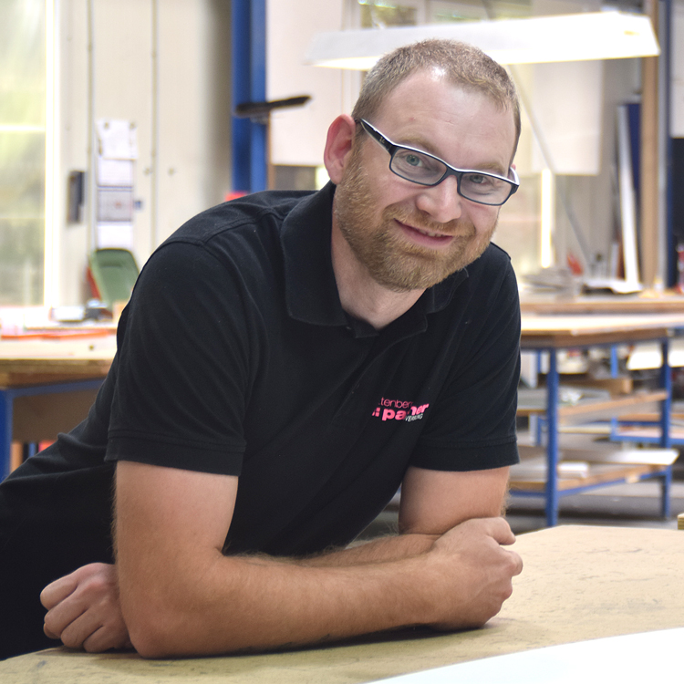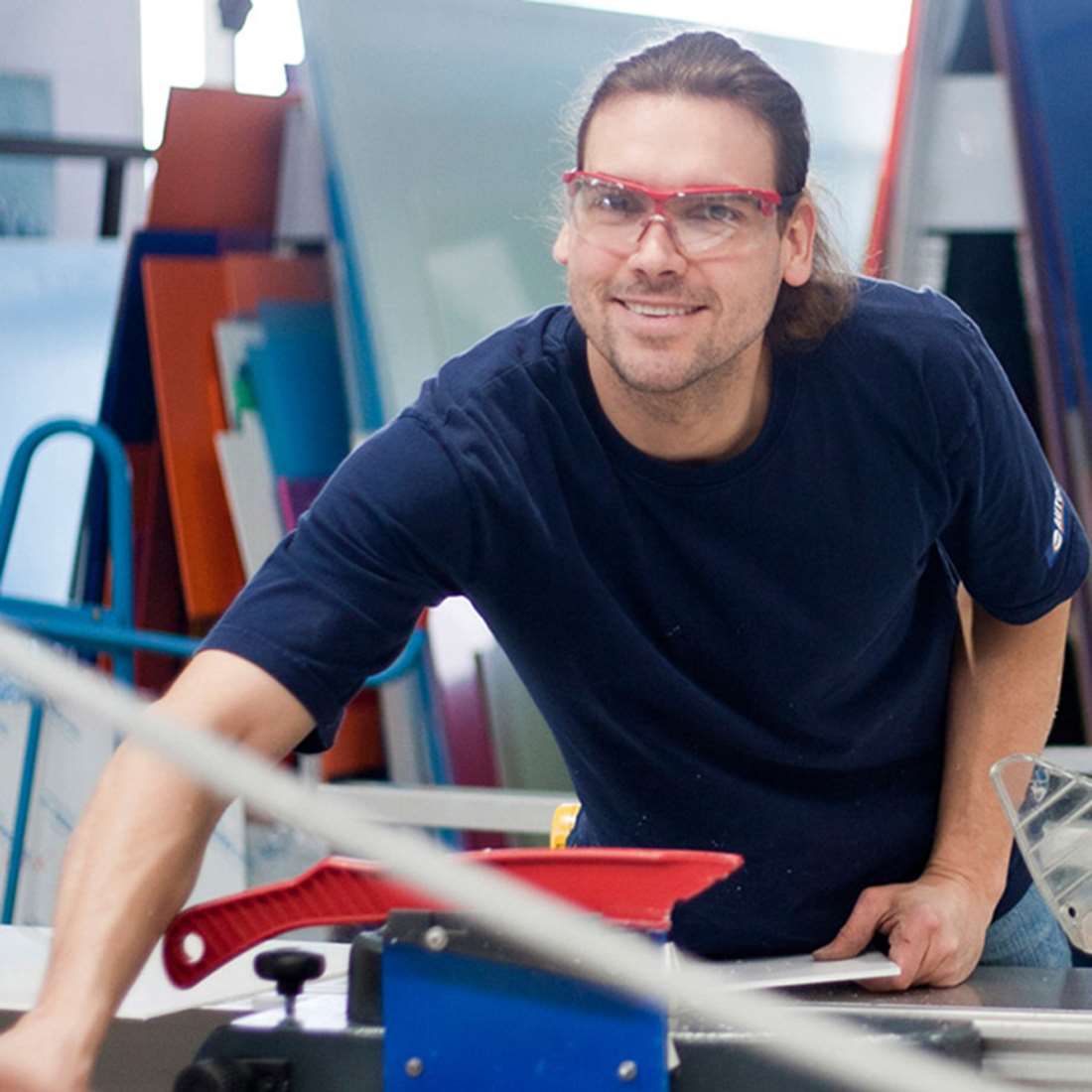 Unsere Schreiner sind nicht auf dem Holzweg, denn sie bearbeiten die Acryl-Elemente, durch die später das Licht nach außen dringt. Acrylspiegel werden in Form gebracht, Buchstaben und Logos aus Acrylglas gebogen und verklebt oder gar riesige farbige Eingangs-Portale hergestellt.